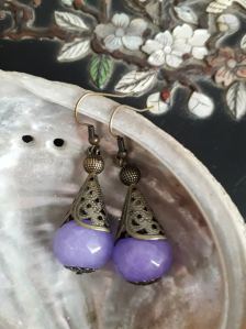 Lavender dyed jade bead drop earrings antique brass fixtures and filigree witches hat detail.