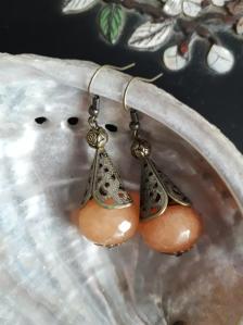 Oriental dyed jade tangerine single drop bead earrings with antique brass fixtures and witches hat detail.