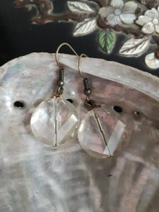 Faceted glass single drop earrings with antique brass fixtures.
