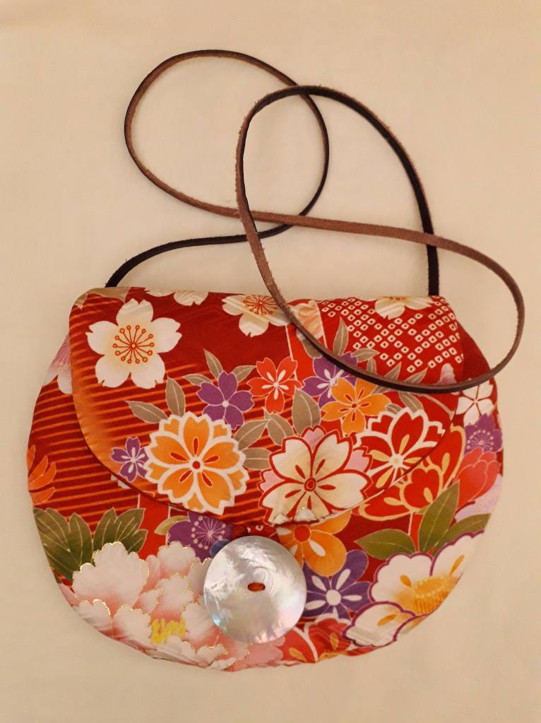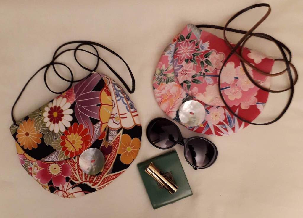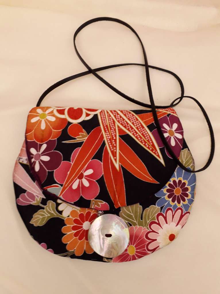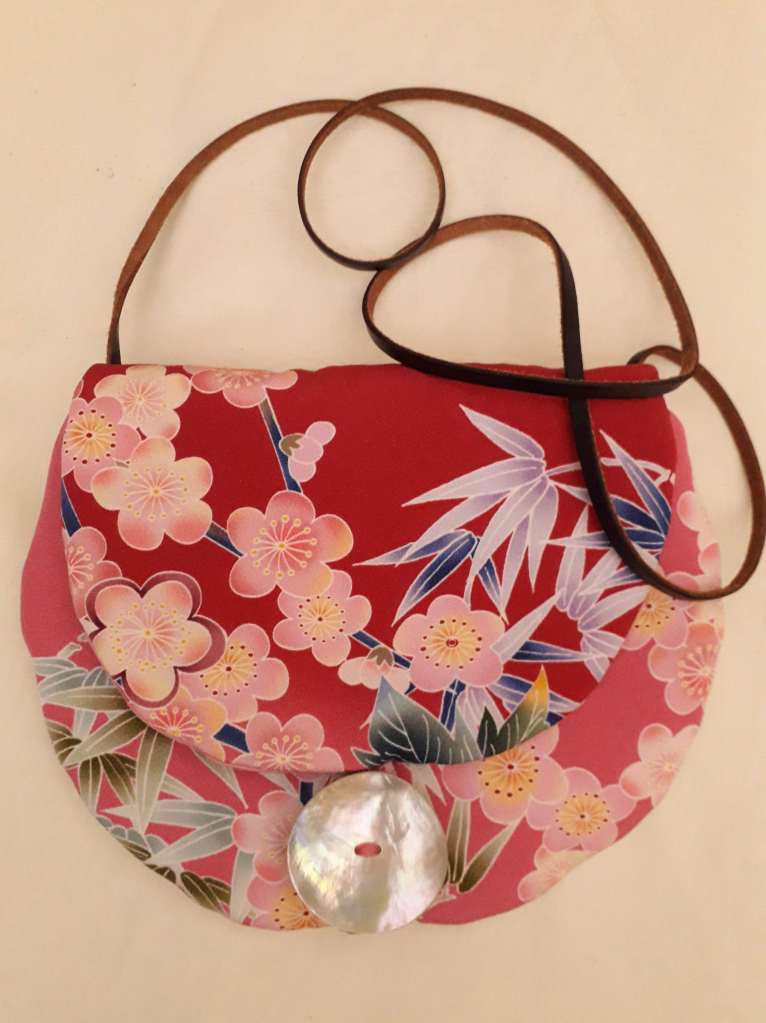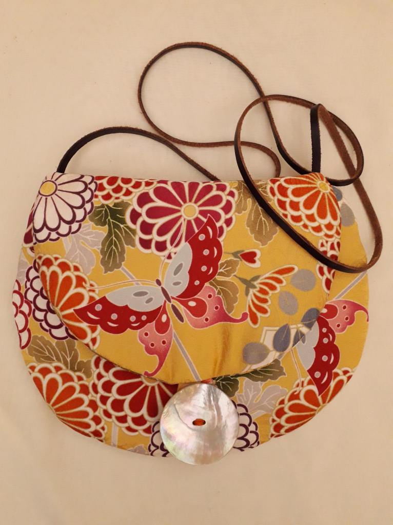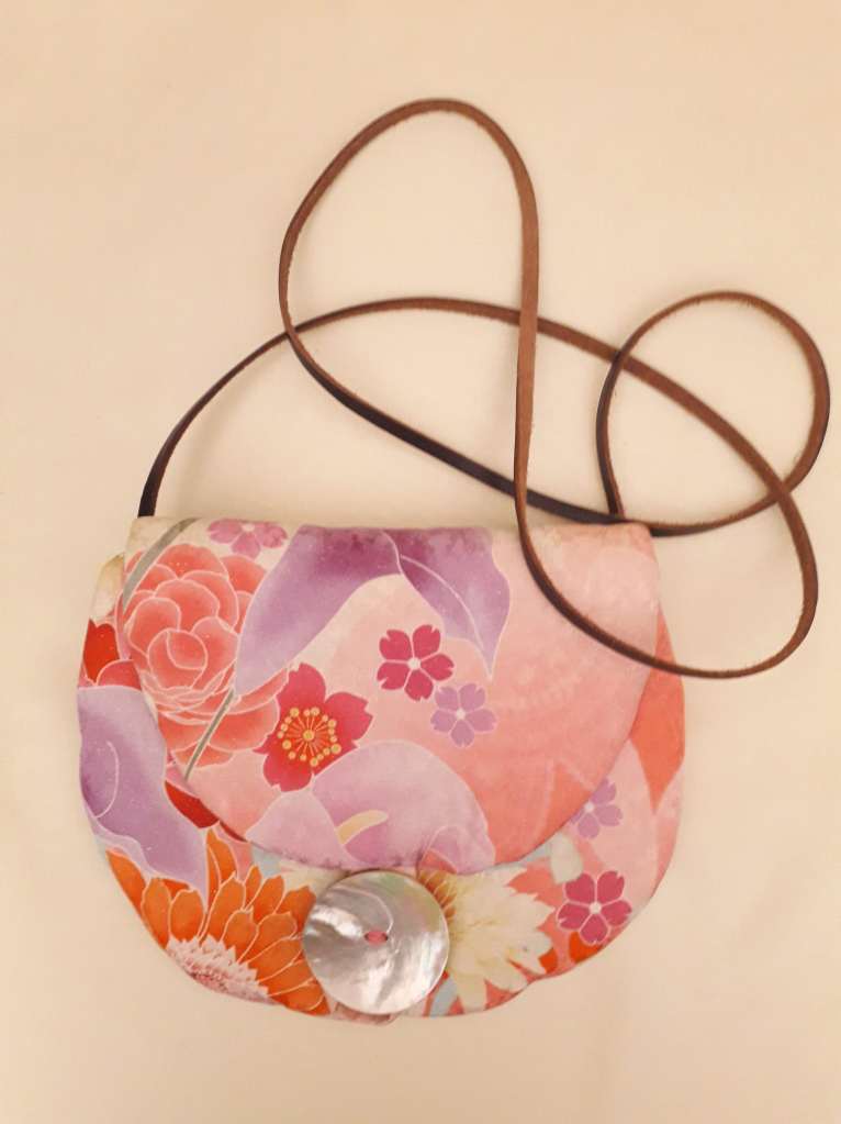 “I use stunning vintage Japanese kimono and obi belt fabrics to make these vibrant cross body bags. Every bit of precious fabric is used including in the lining and backing and each bag is finished with a vintage button”
