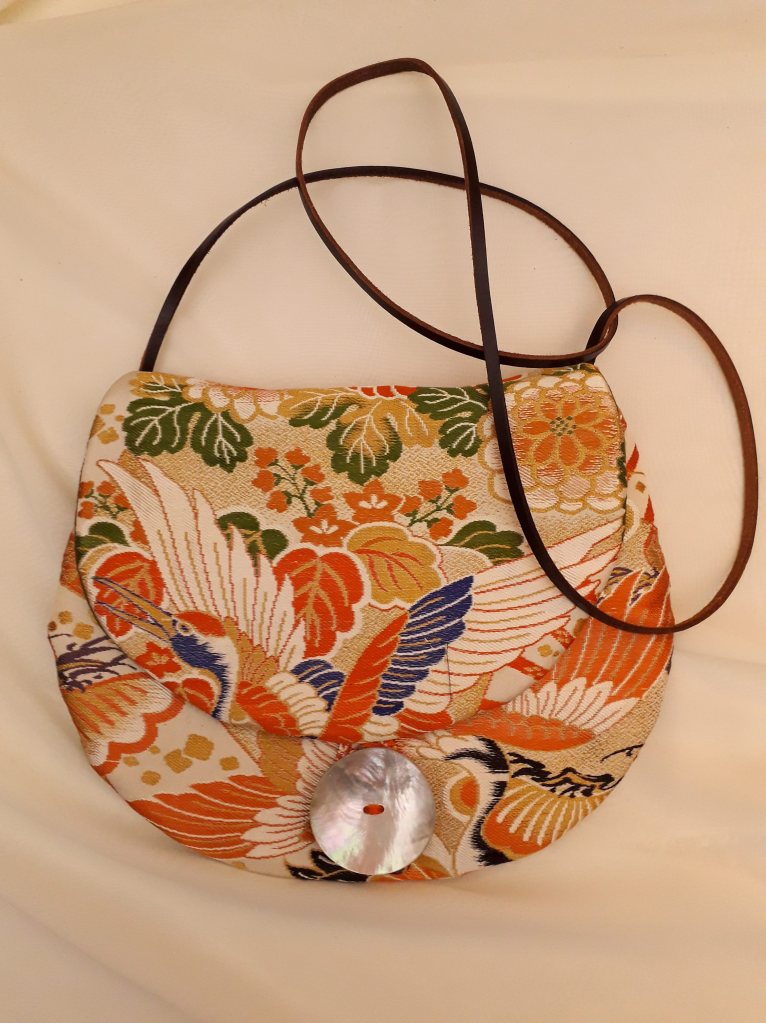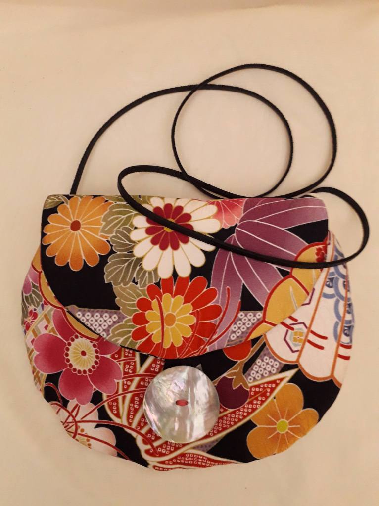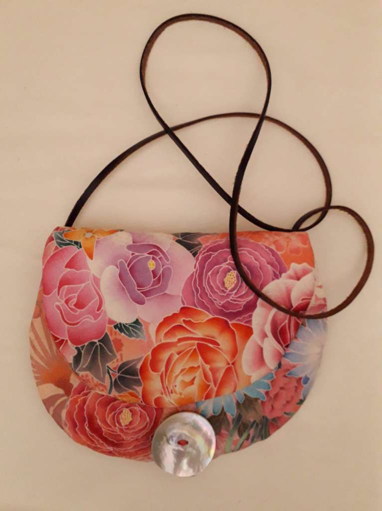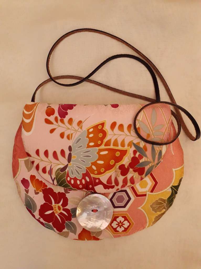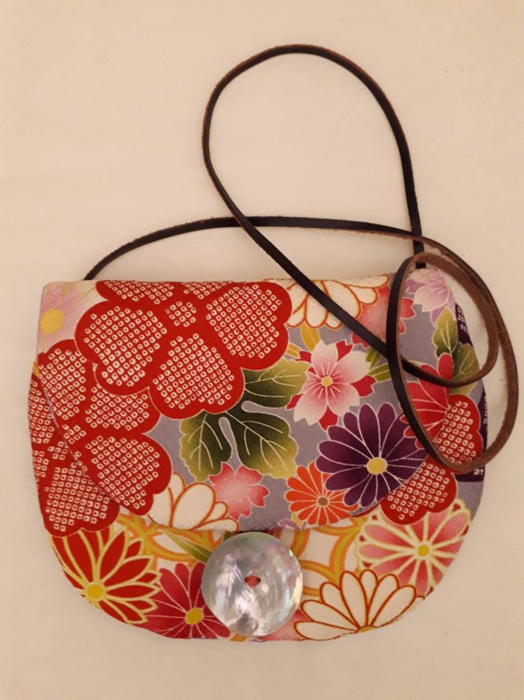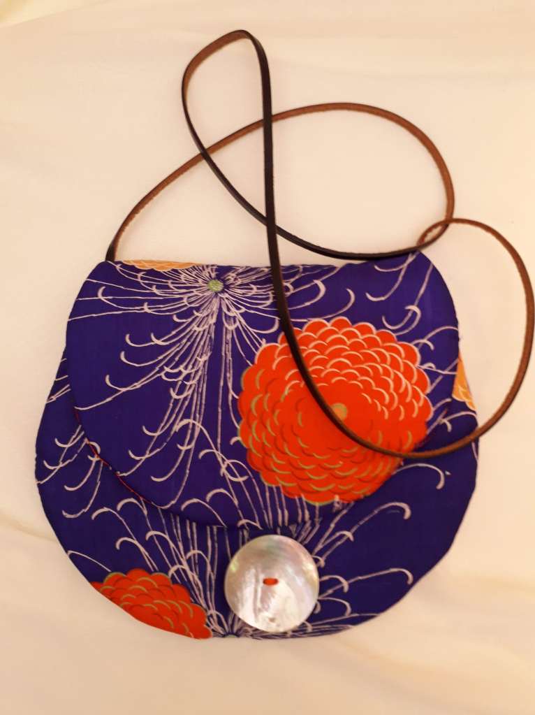 “I use stunning vintage Japanese kimono and obi belt fabrics to make these vibrant cross body bags. Every bit of precious fabric is used including in the lining and backing and each bag is finished with a vintage button”