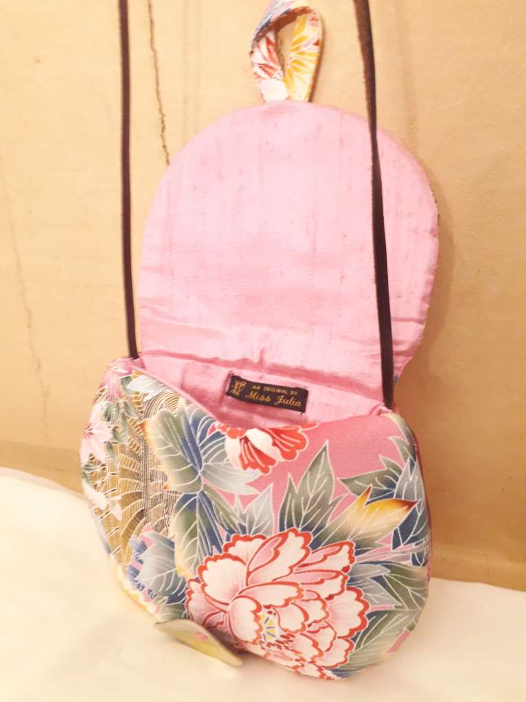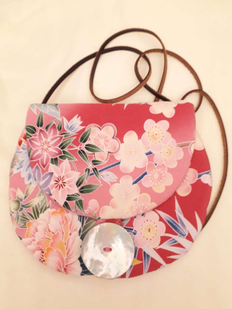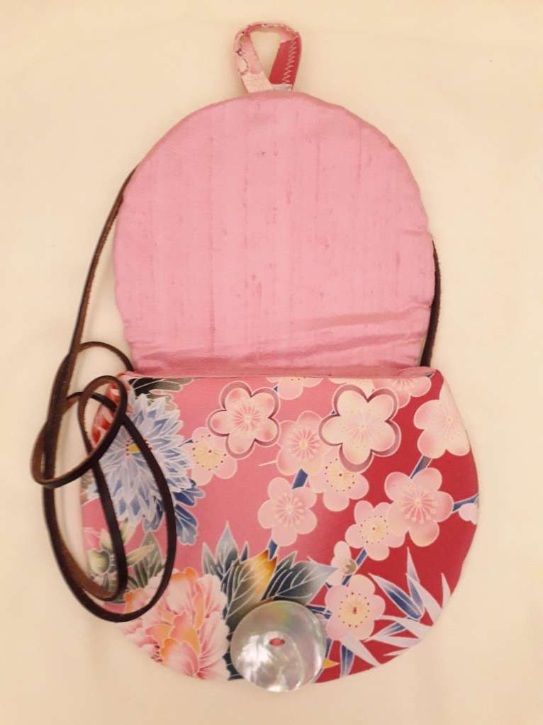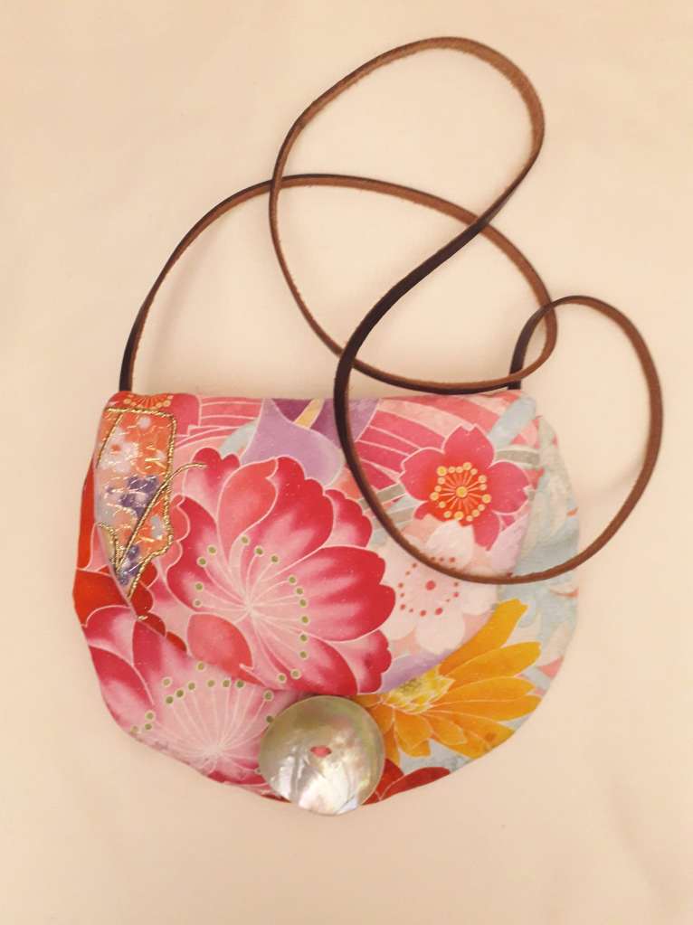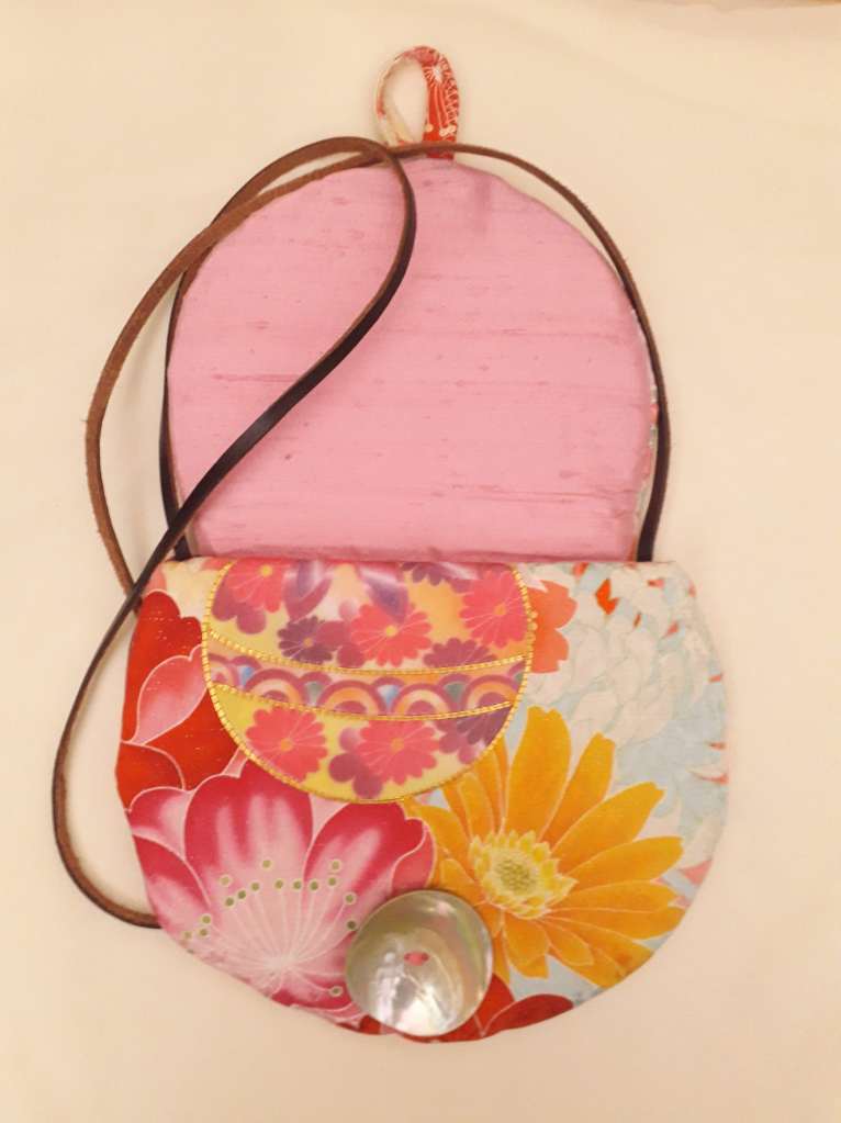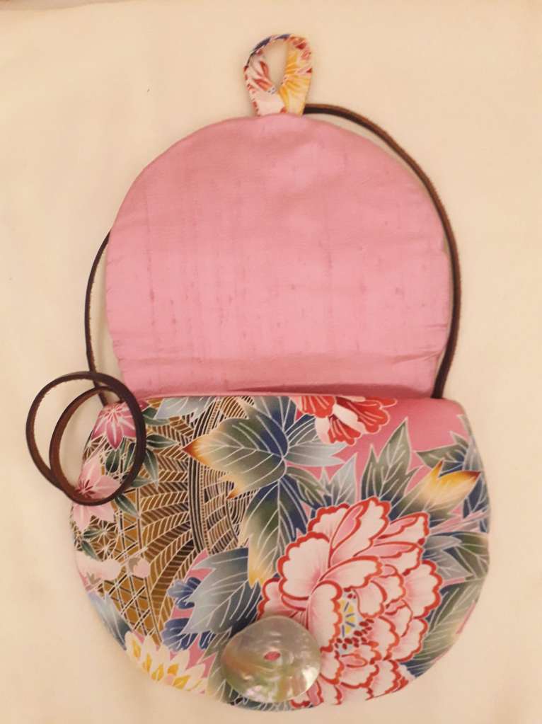 Cross-body bag floral print kimono fabric. Backed with matching metallic pink soft leather and fully lined with pink silk. Hand finished with beautiful natural agoya shell button fastening.