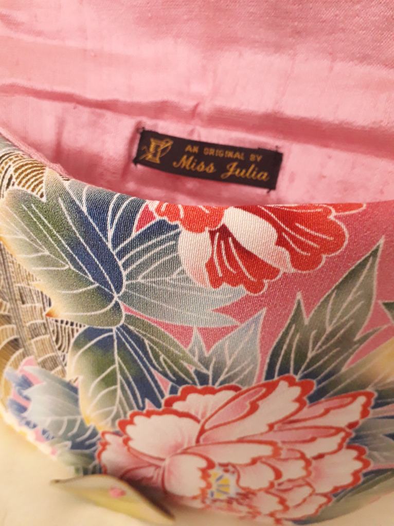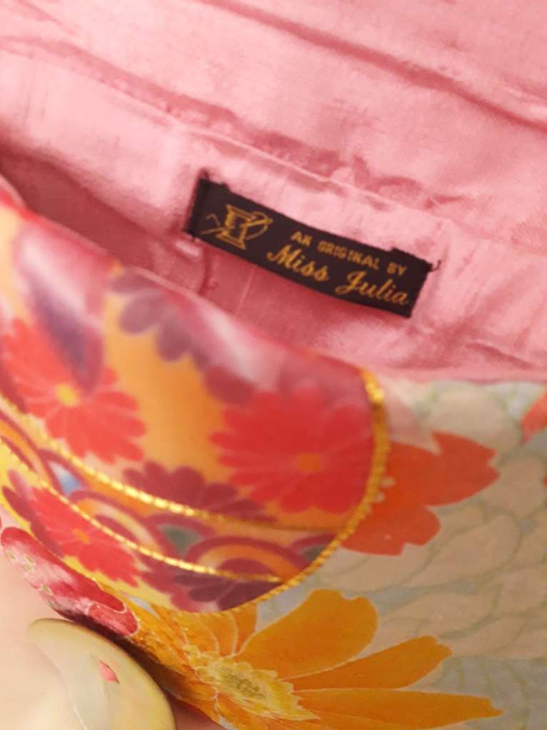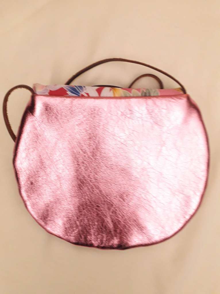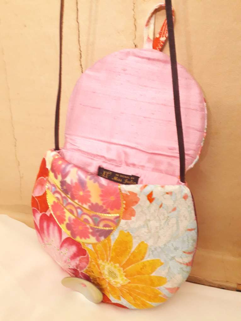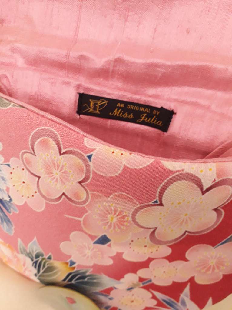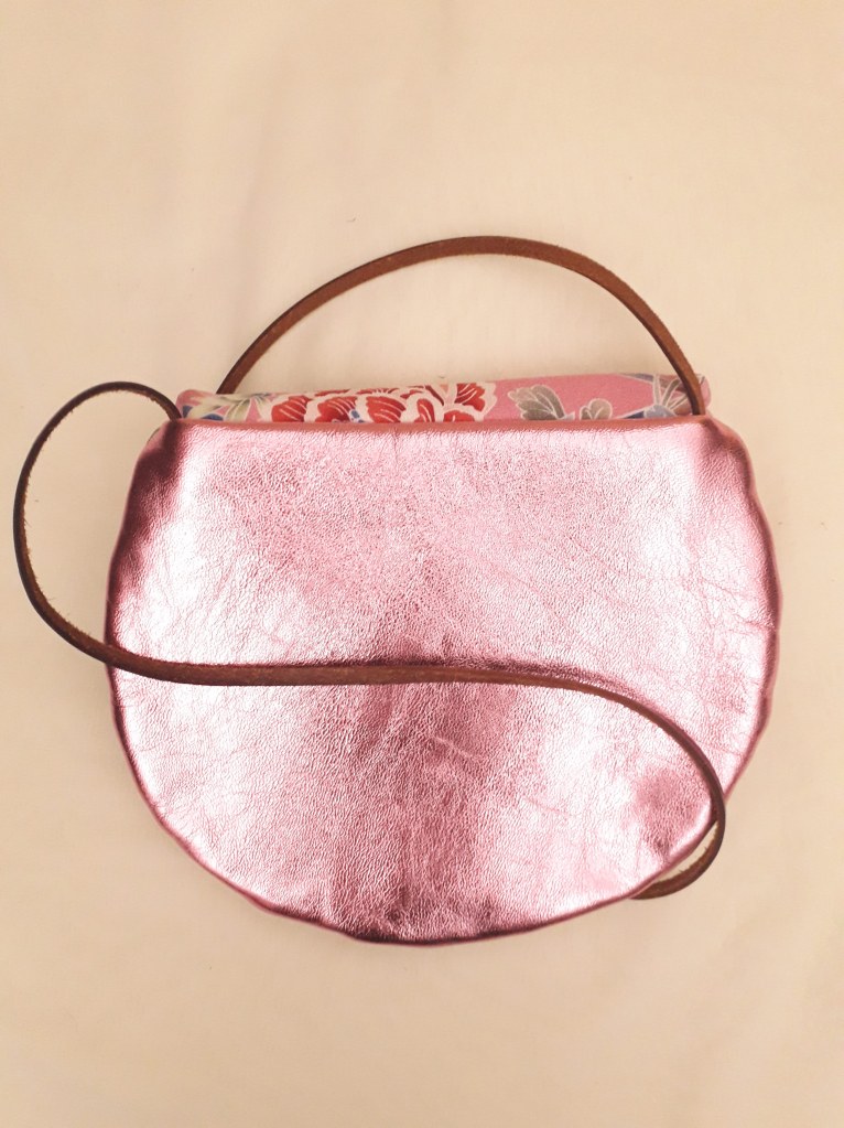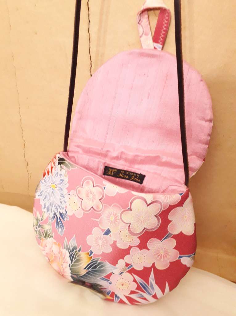 Cross-body bag floral print kimono fabric. Backed with matching metallic pink soft leather and fully lined with pink silk. Hand finished with beautiful natural agoya shell button fastening.