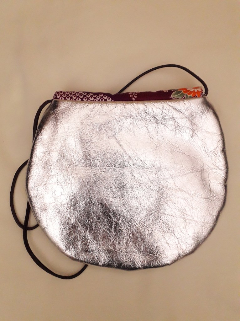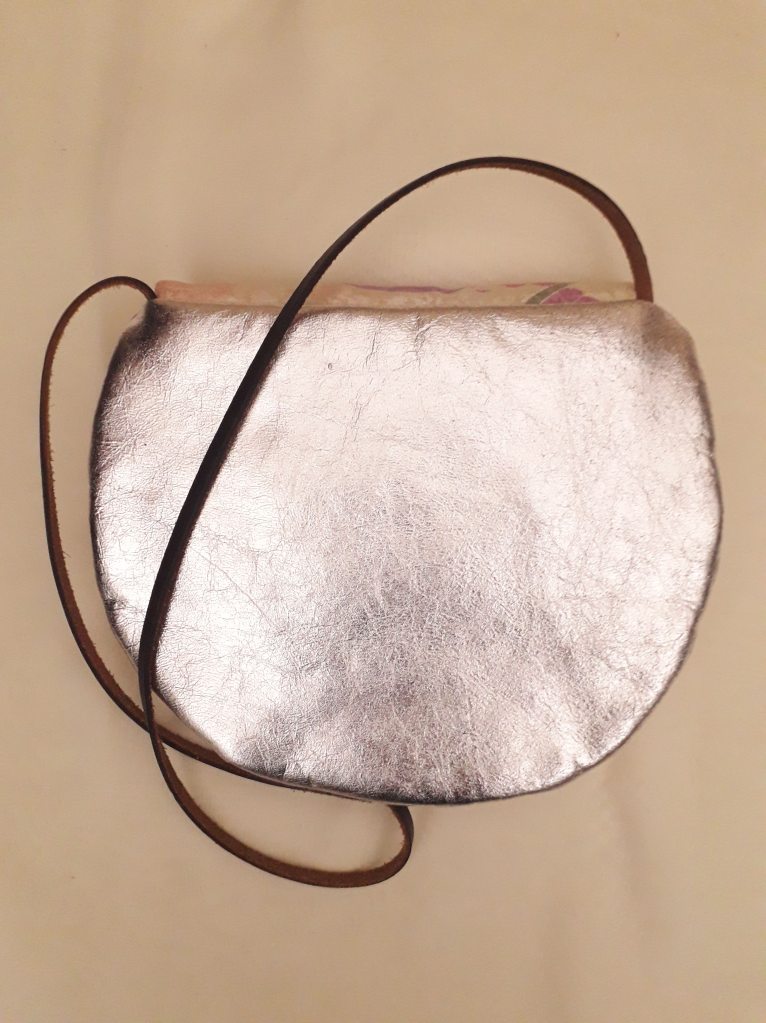 Very pretty printed silk crepe kimono fabric cross-body bag. Backed with soft metallic silver leather and fully lined with pink silk. Hand finished with agoya shell button fastening and brown leather strap.