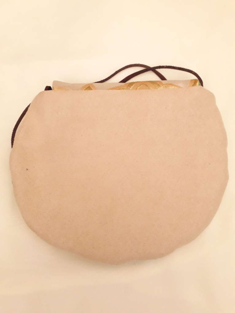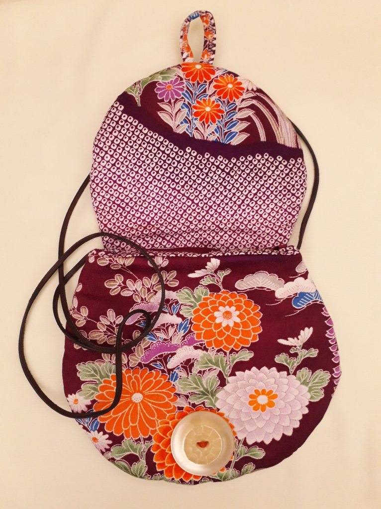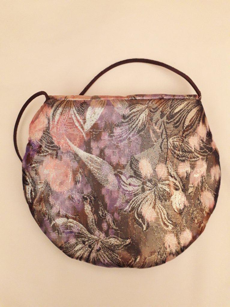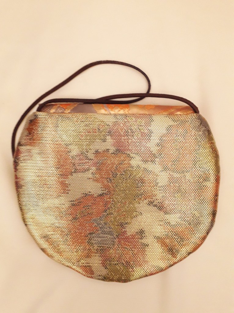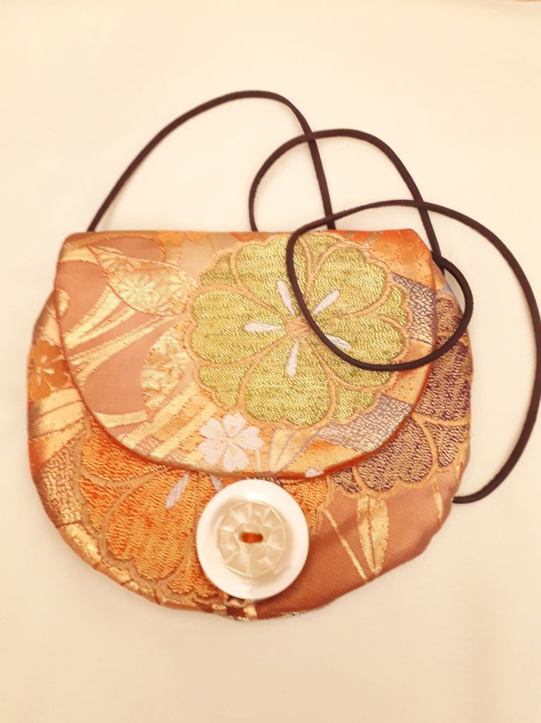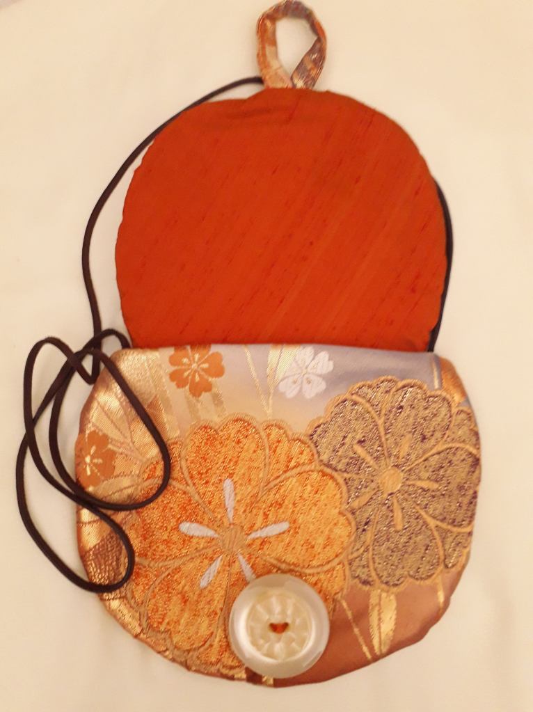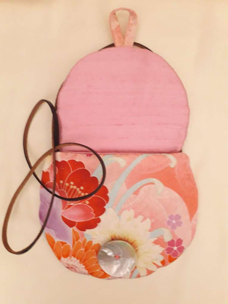 Beautiful silk kimono fabric with dusty pink and lilac flowers and shimmery gold threaded leaves. Backed with matching fabric and fully lined with pretty lilac silk. Hand finished with agoya shell button fastening and brown leather strap.