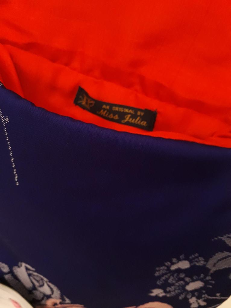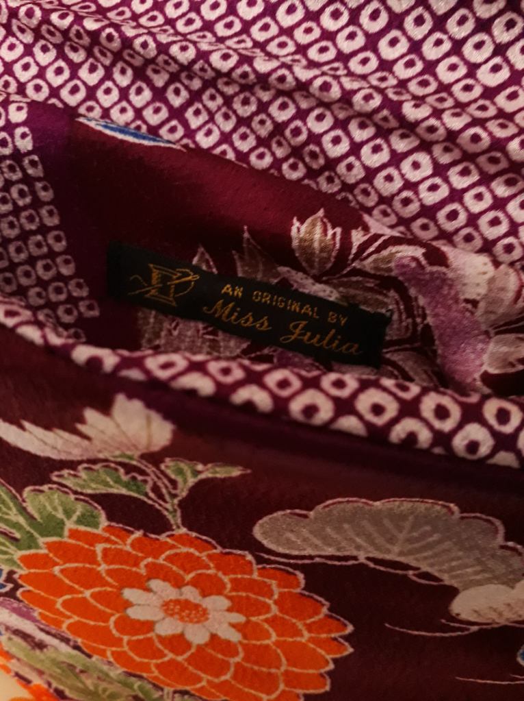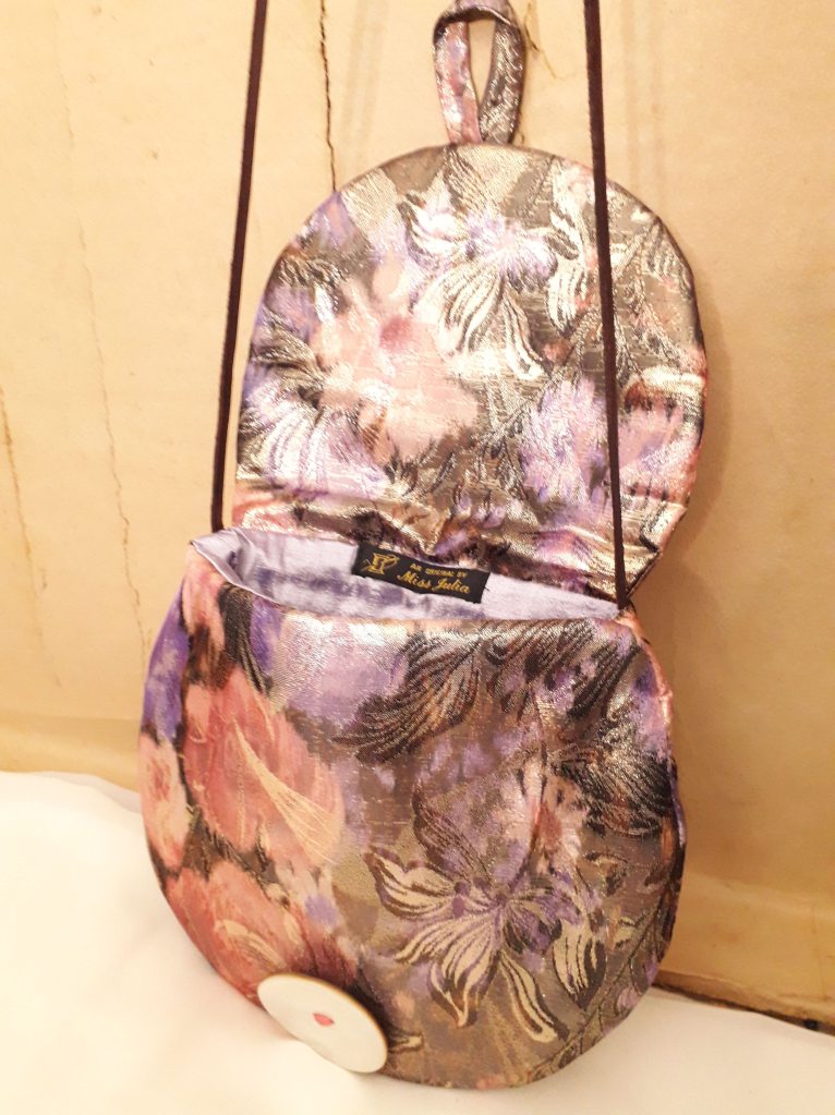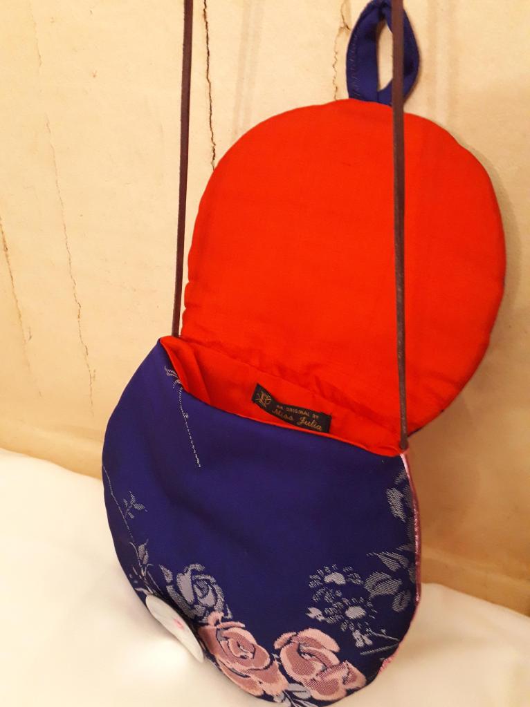 Striking purple silk kimono fabric cross-body bag with dusty pink rose design. Backed with soft metallic pink leather and fully lined with bright red silk. Hand finished with vintage pearl button and brown leather strap.