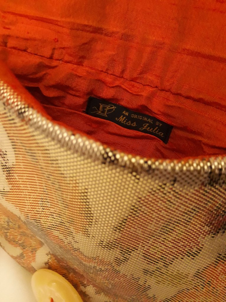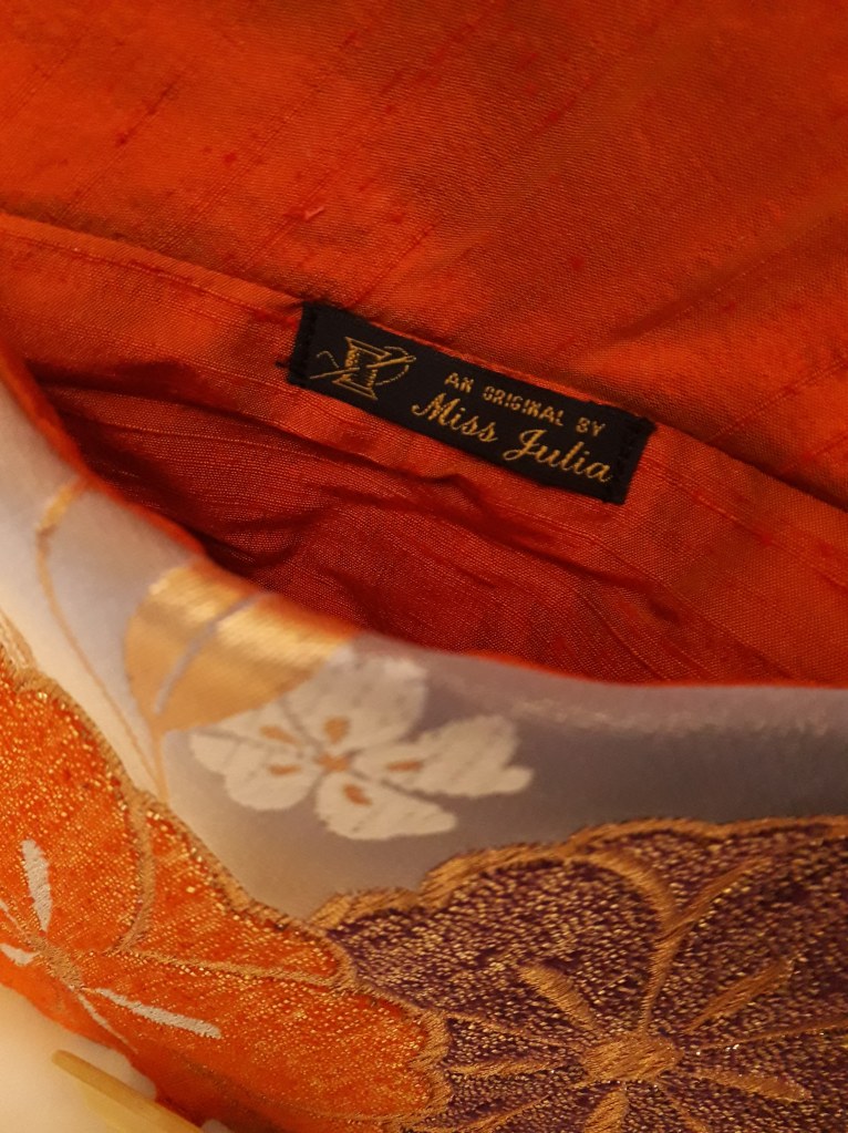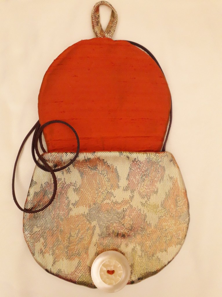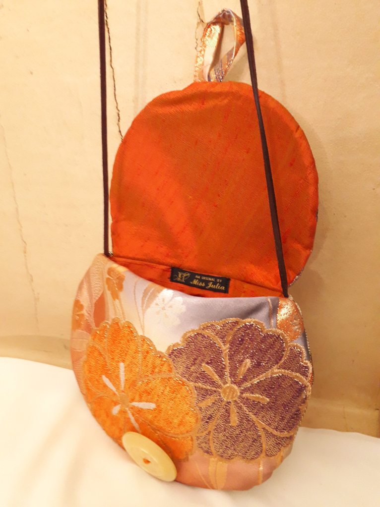 Shimmery vintage obi fabric cross-body bag with subtle flower design in the weave. Backed with soft pale blue metalic leather and fully lined with bright orange silk. Hand finished with vintage button fastening and brown leather strap.