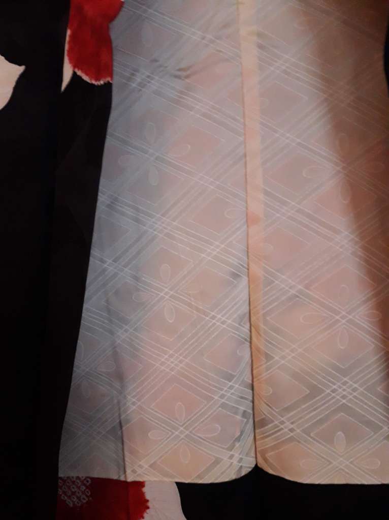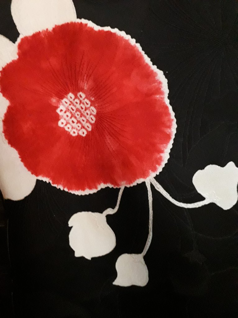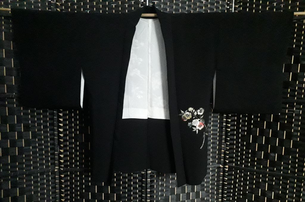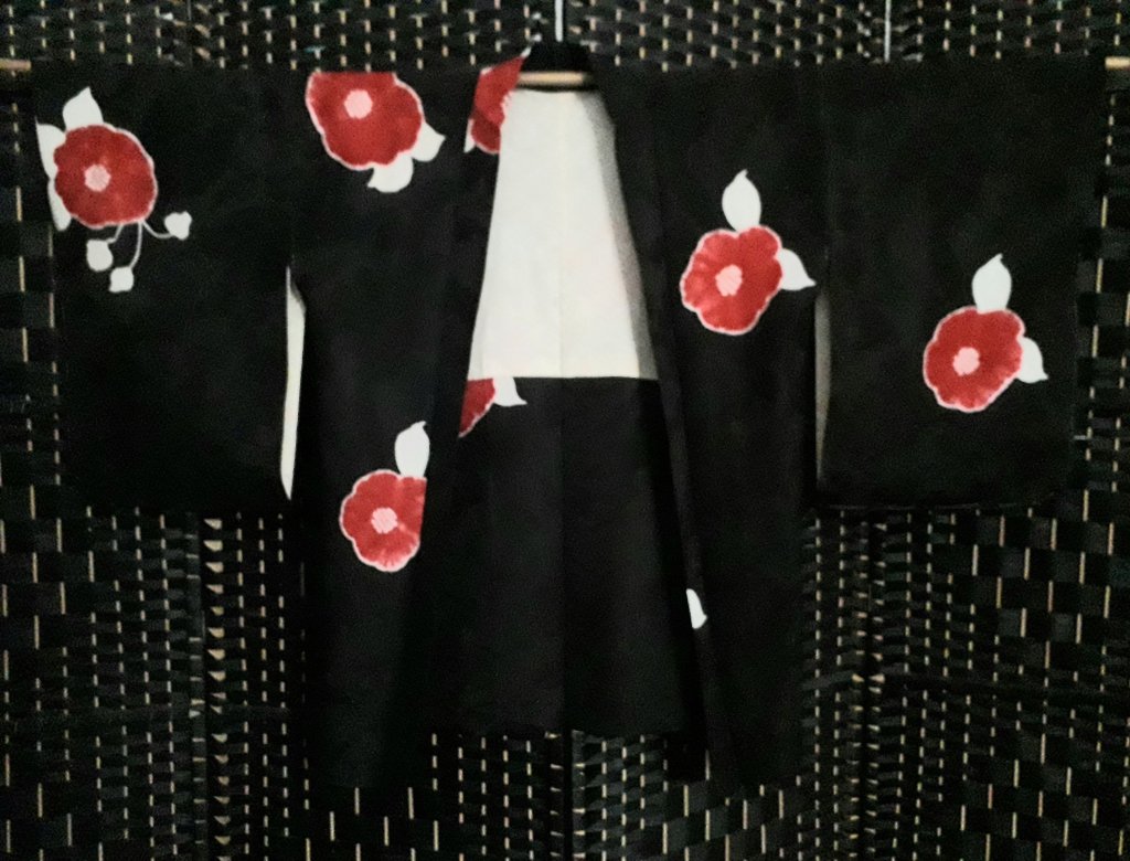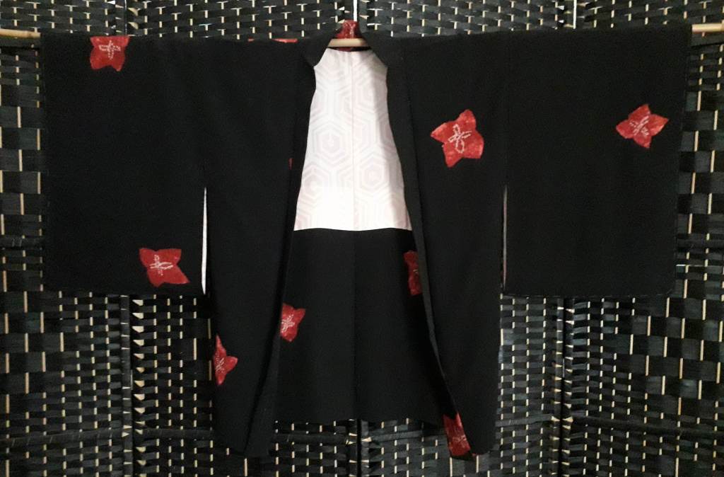 Black crepe haori kimono jacket with beautiful deep pink shibori