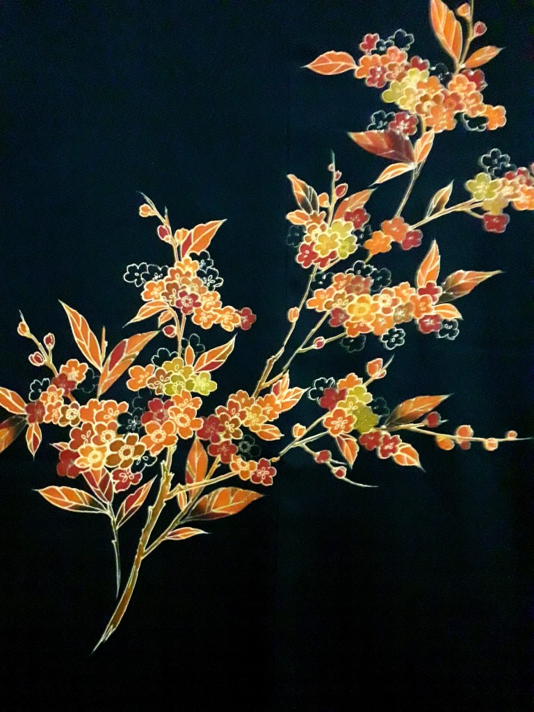 Striking flower branch placement print in deep oranges reds and olive greens on smooth black haori kimono jacket. Size M/L