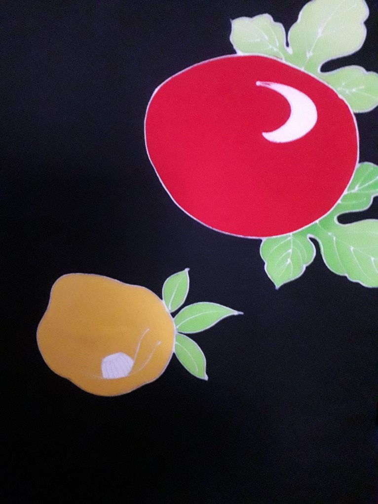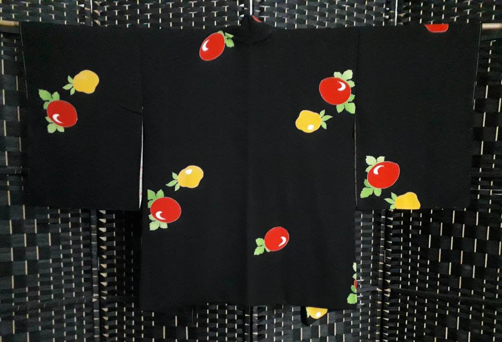Fabulous bright ‘Tutti Frutti’ placement print on black smooth haori jacket. Half lined in excellent condition. Size S