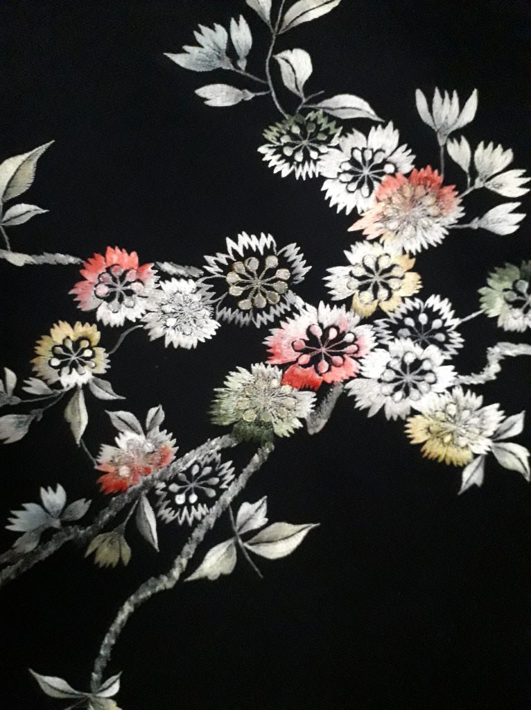 Beautiful smooth black haori kimono jacket with very pretty soft pink yellow and pale green silk embroidered flower detail. Half lined in excellent condition. Size M (scarf not included)
