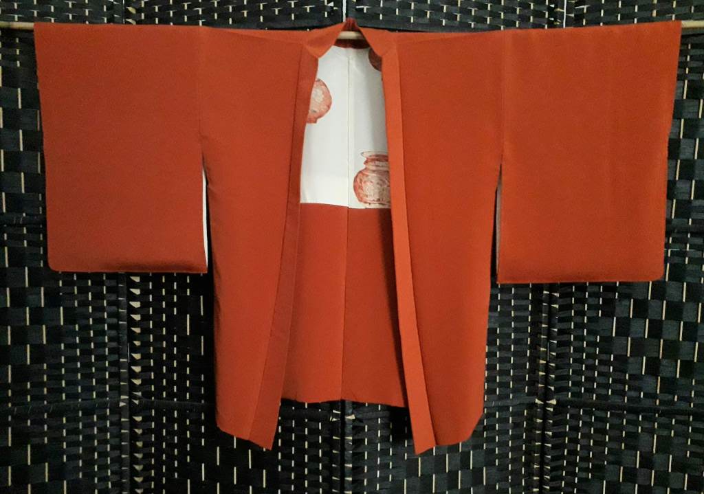 Burnt orange crepe haori kimono jacket with handstitched French knot design