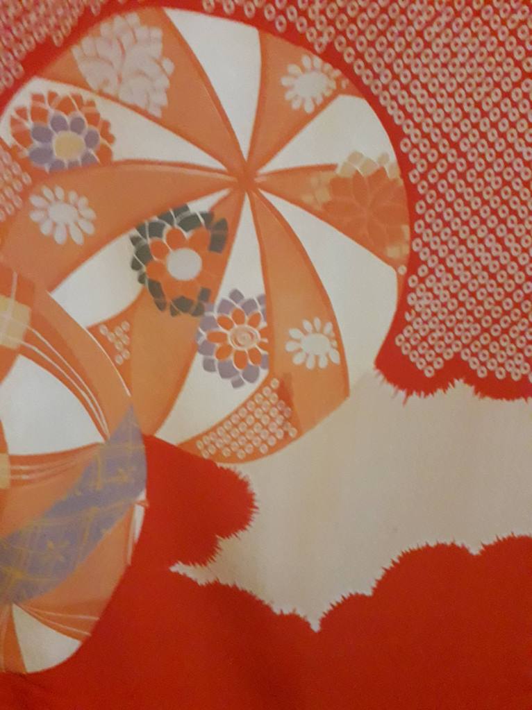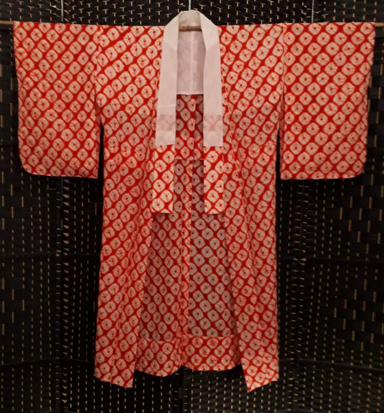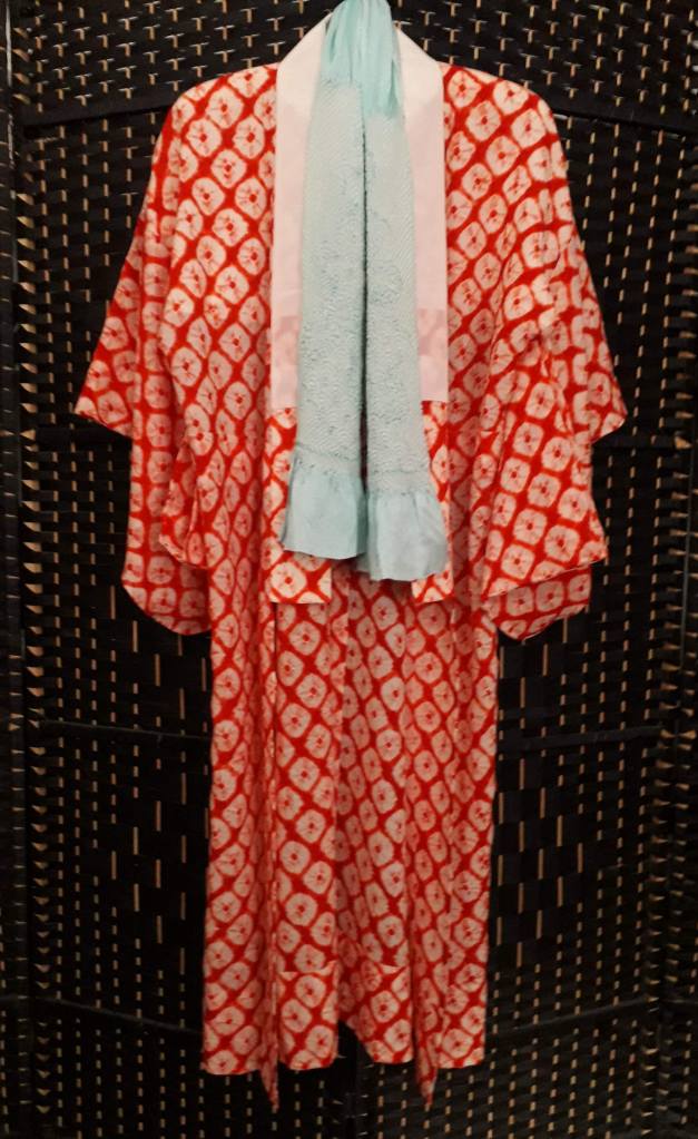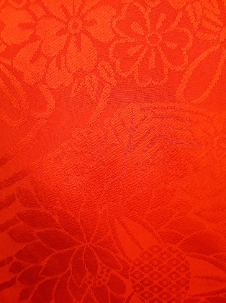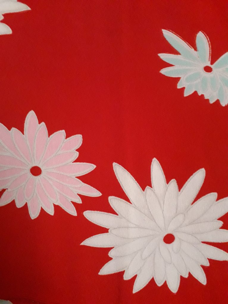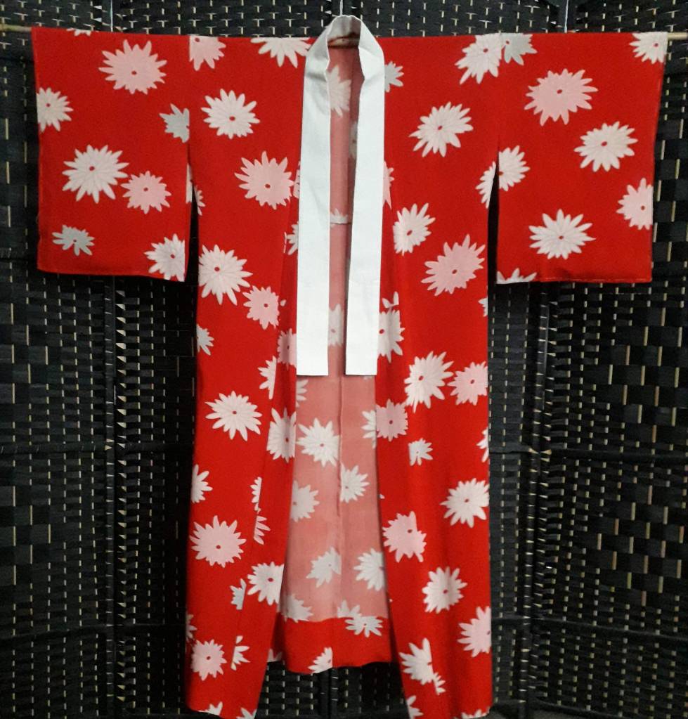 1950s Red Crepe Kimono with Pale pink flowers – SOLD