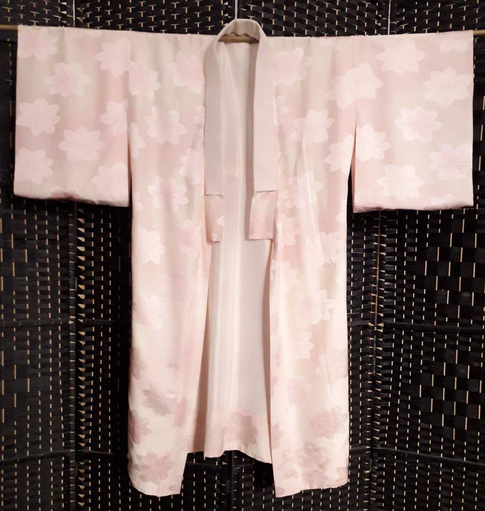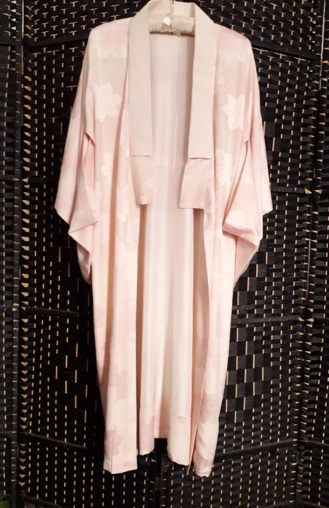 Beautiful vintage 1950’s crepe juban kimono with very pretty pale pink, pastel blue and ivory flowers outlined in soft pale grey. Unlined in excellent condition. Size L