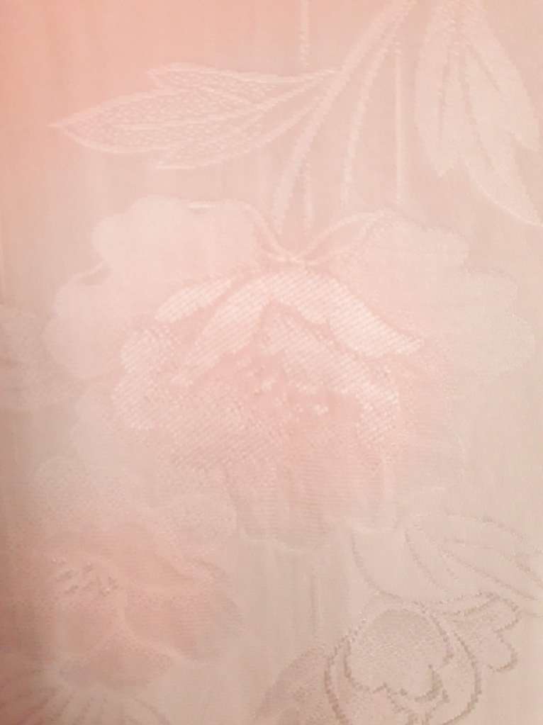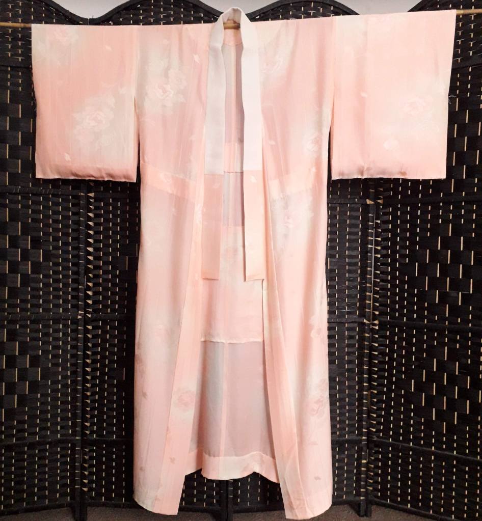 Beautiful peachy pink and ivory lightweight silky kimono with pretty woven flowers. Semi lined in the seat. Excellent condition Size M/ L