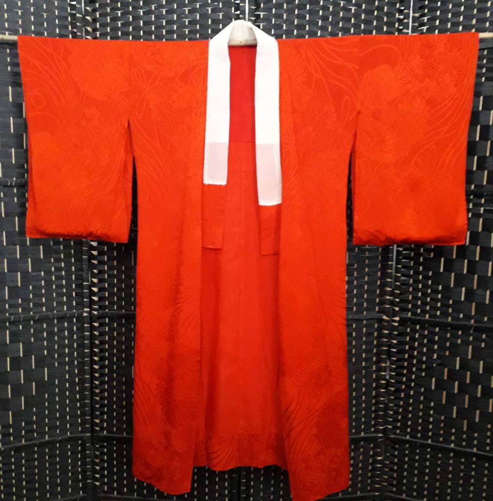 Absolutely gorgeous vintage 1950’s silk vermillion red juban kimono with beautiful floral jacquard weave detail. Unlined in excellent condition. Perfect styled with a bight crossbody bag! Size S/M