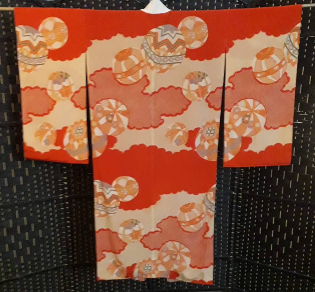 Elegant vintage 1930’s bright orange and very pale peach crepe kimono with playfull tamari ball print in stunning soft tonal colours of orange, golden yellow, olive green and mauve. Fully lined with red silk. Excellent condition. Size S/M