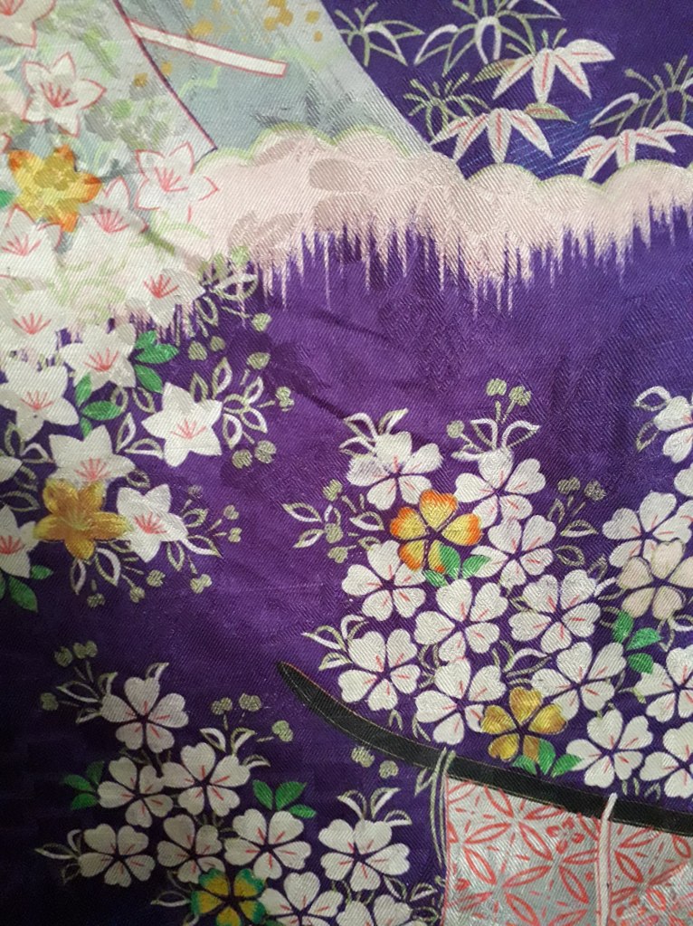 Stunning very rare purple vintage 1930’s silk kimono with beautiful shimmery cream and yellow flowers with pretty green leaves. Fully lined with orange silk and dusty pale pink silk crepe. Excellent condition. Size M