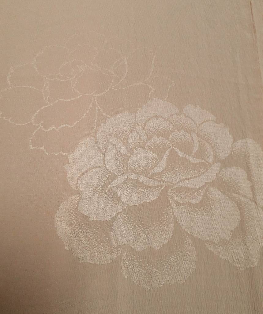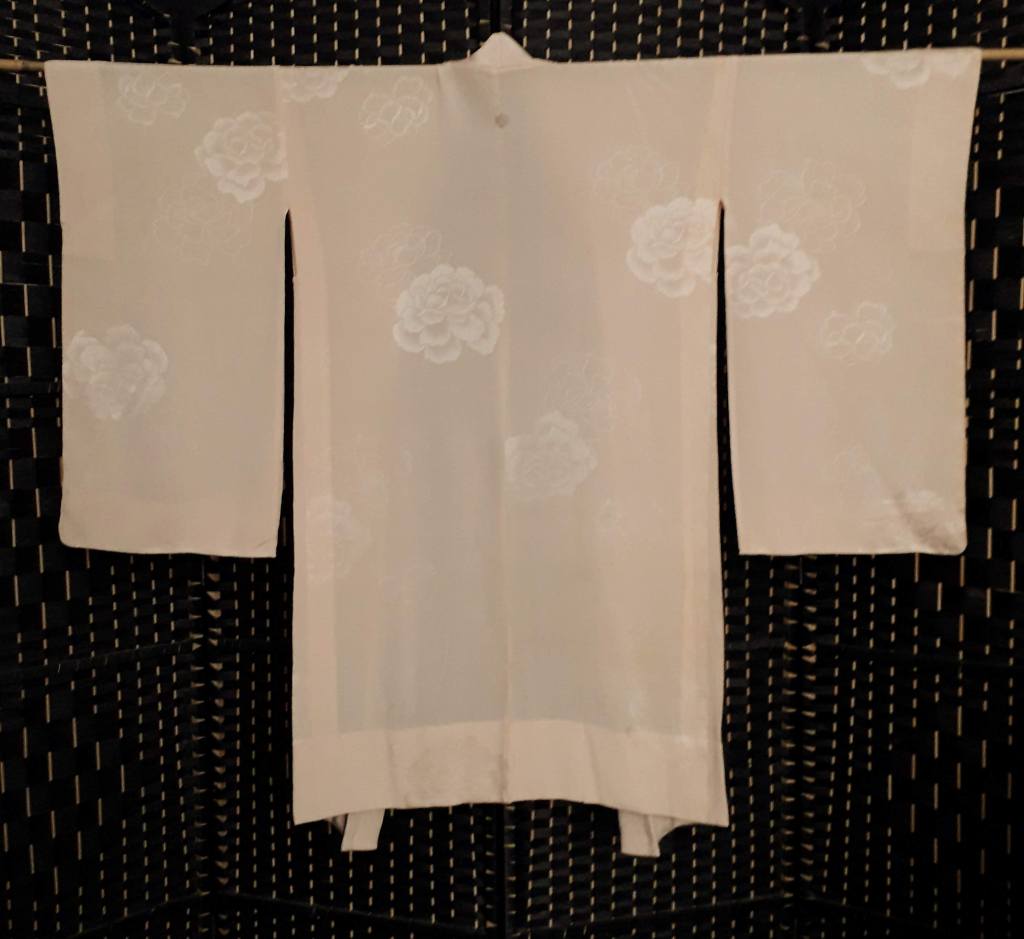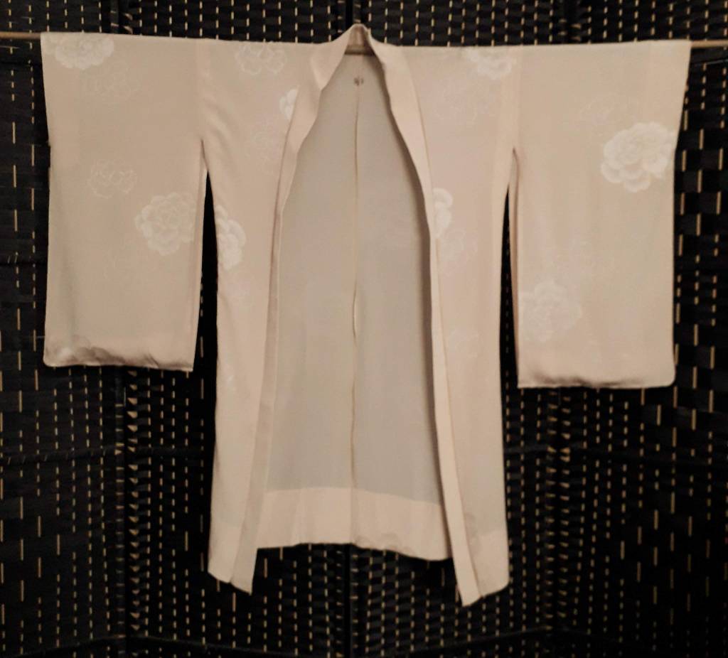 Gorgeous lightweight soft cream coloured vintage silk crepe juban kimono with stunning jacquard woven flower detail. Excellent condition Size S