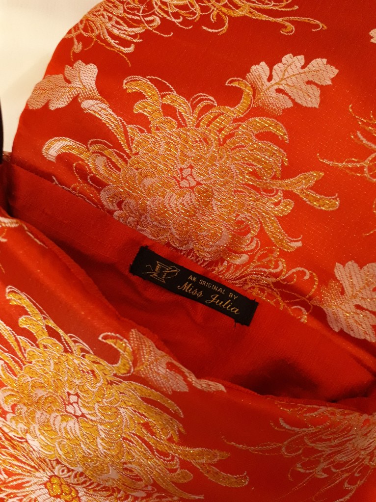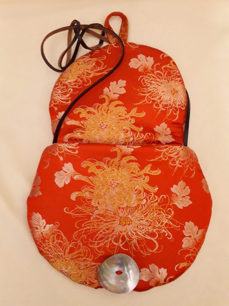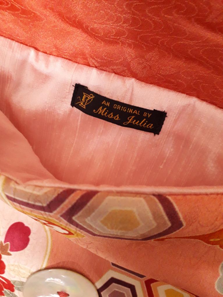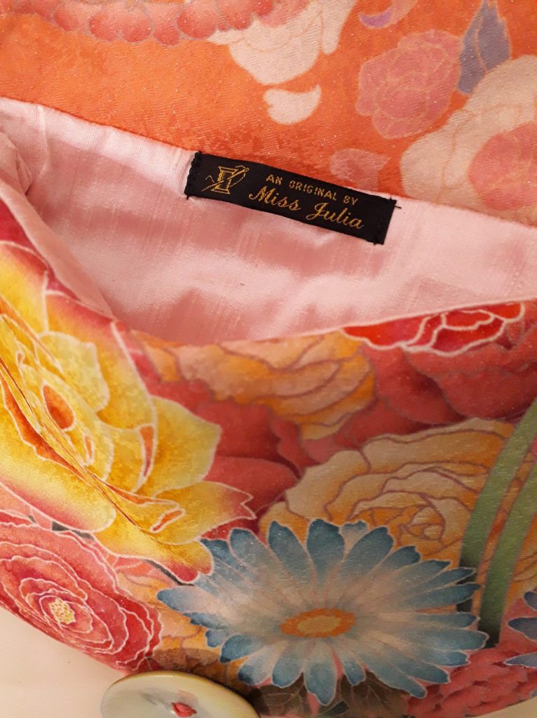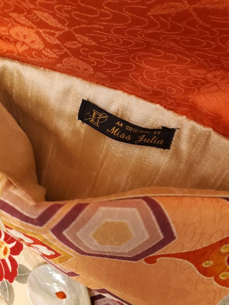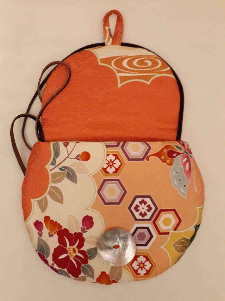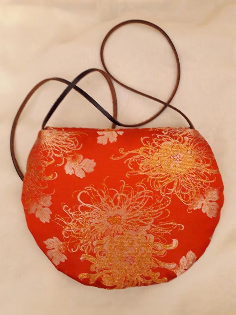 This is a medium size crossbody bag made from gorgeous vintage silk kimono fabric with woven gold thread detail. Fully lined with vibrant orange silk and hand finished with a beautiful agoya shell button fastening and brown leather strap.