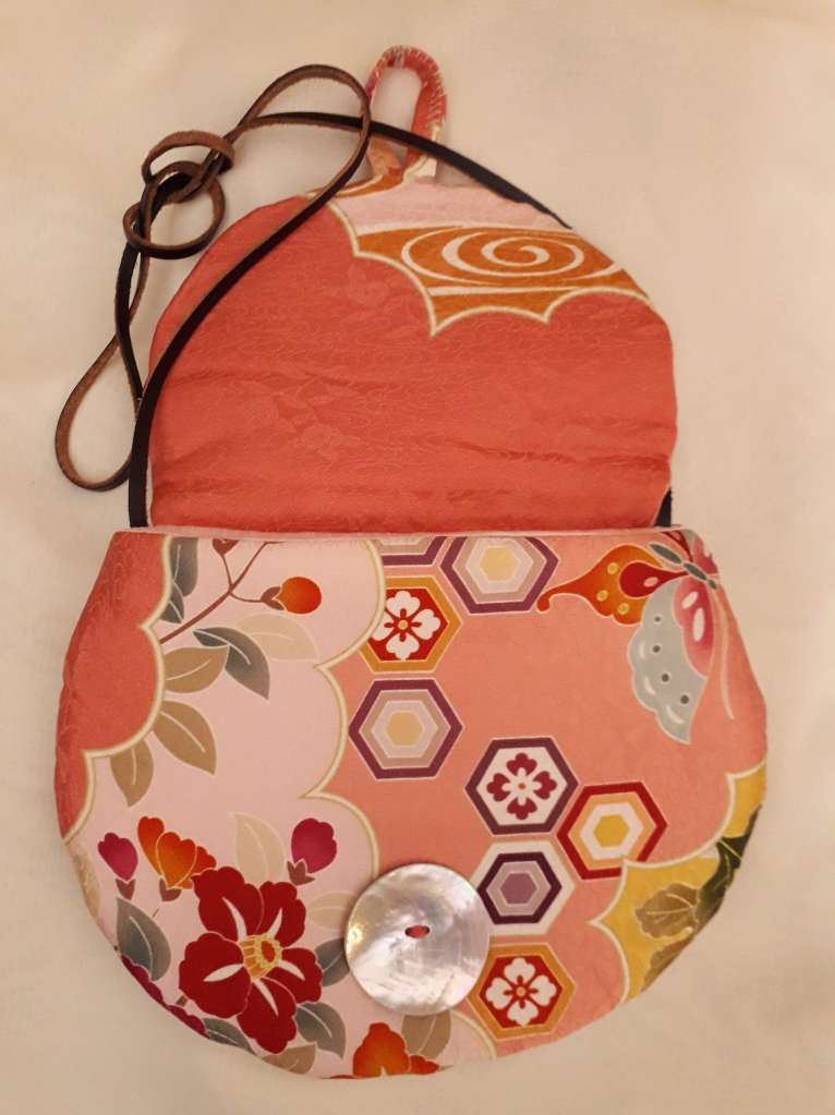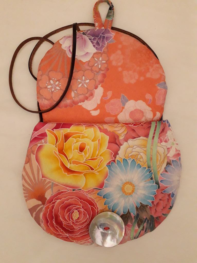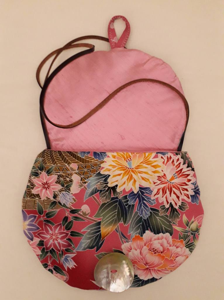 Medium size crossbody bag made from stunning printed silk crepe kimono fabric and fully lined with silk. Backed with soft pale rose gold metallic leather complimenting the colours in the print and hand finished with a beautiful agoya shell button fastening and brown leather strap