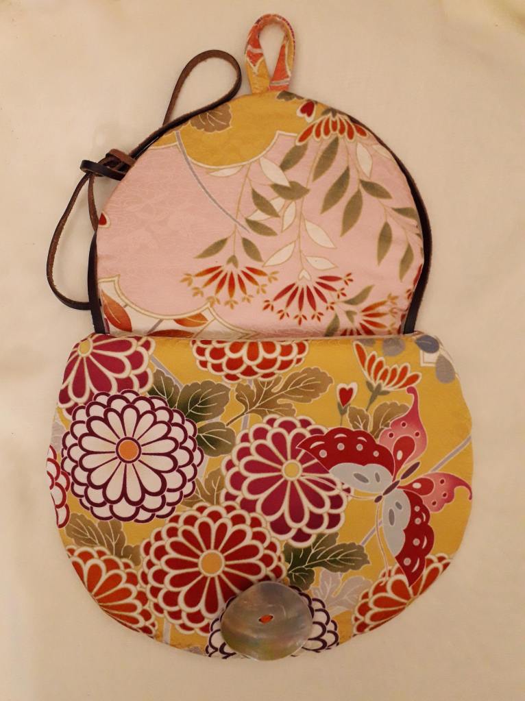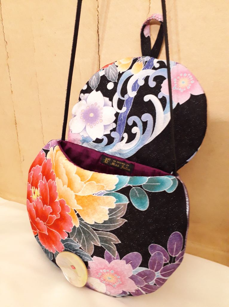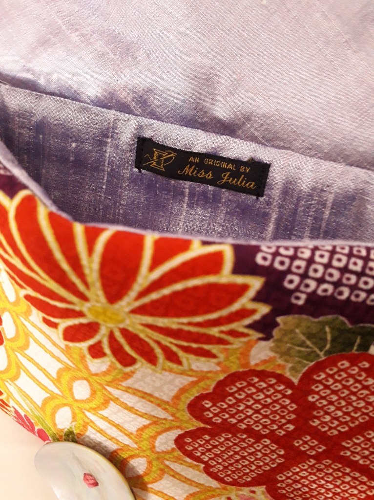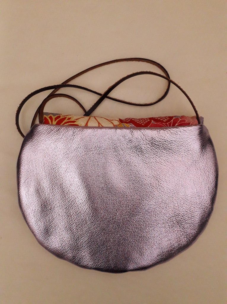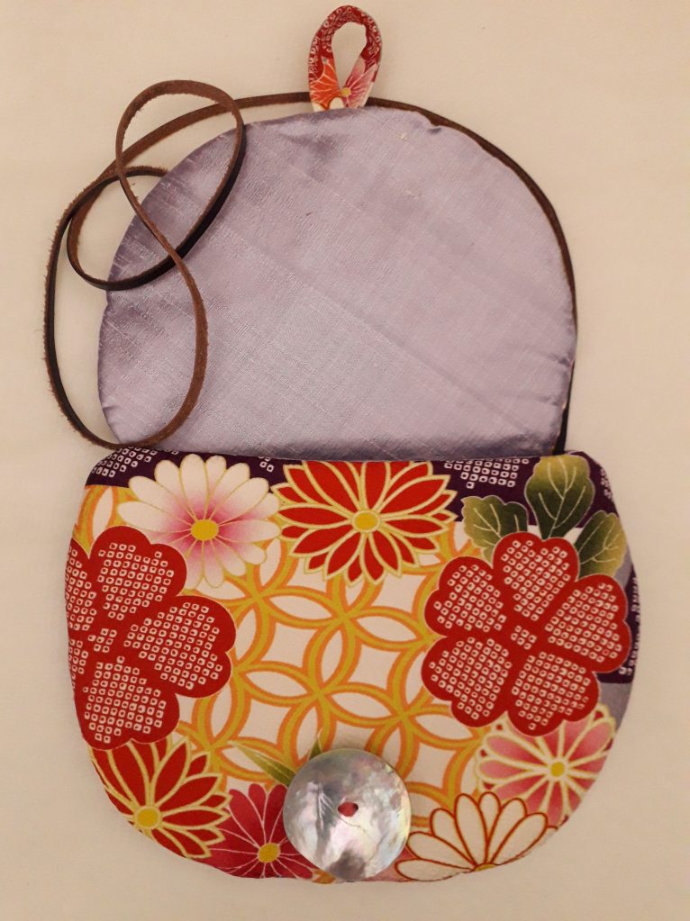 Medium size cross-body bag made from absolutely gorgeous vibrant printed silk crepe kimono fabric with gold specs and fully lined with silk. Backed with soft lilac metallic leather, hand finished with agoya shell button and black leather strap