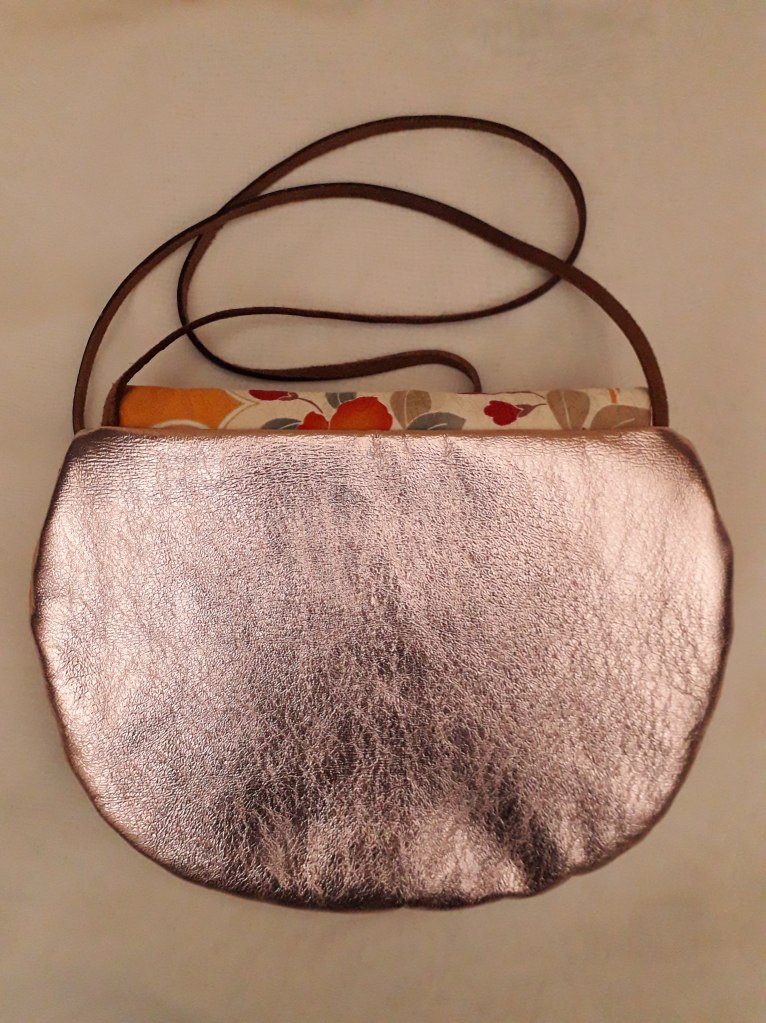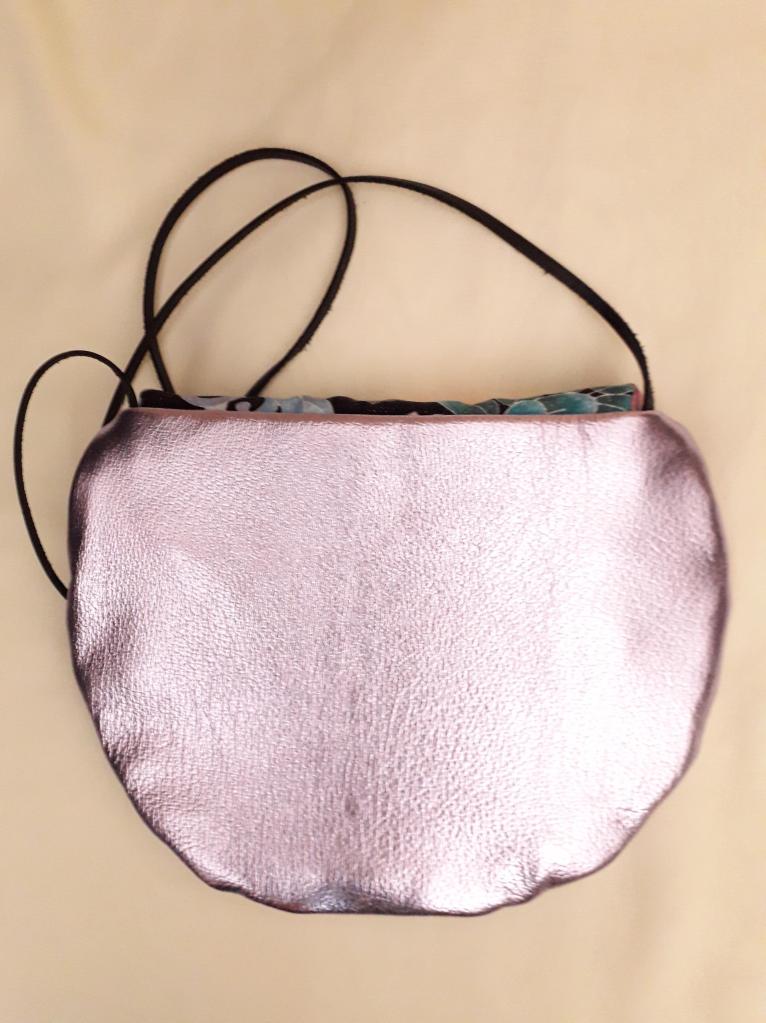 Each bag is backed with soft pale rose gold metallic or lilac leather complimenting the colours in the print and hand finished with a beautiful agoya shell button fastening and brown leather strap. All of my bags are handmade and each one is unique piece.