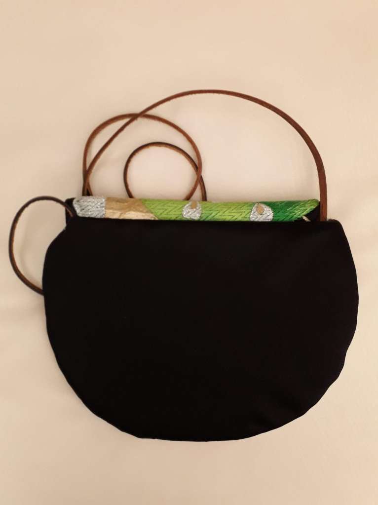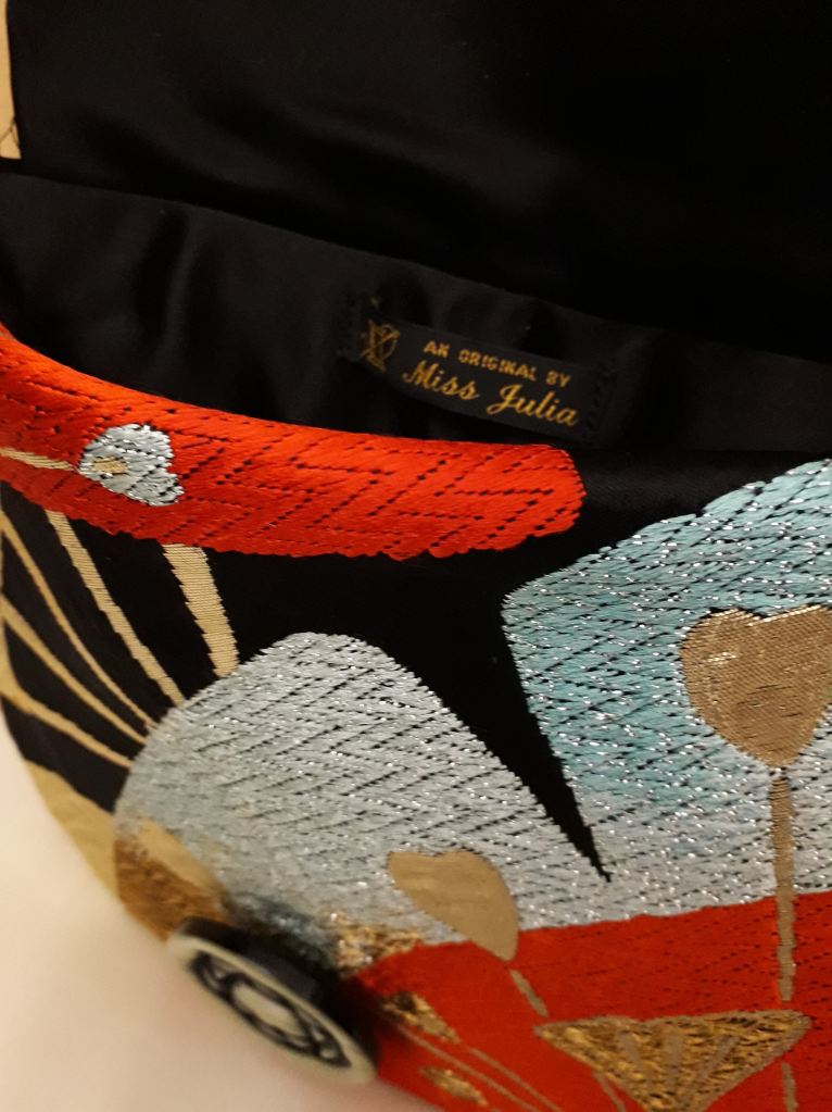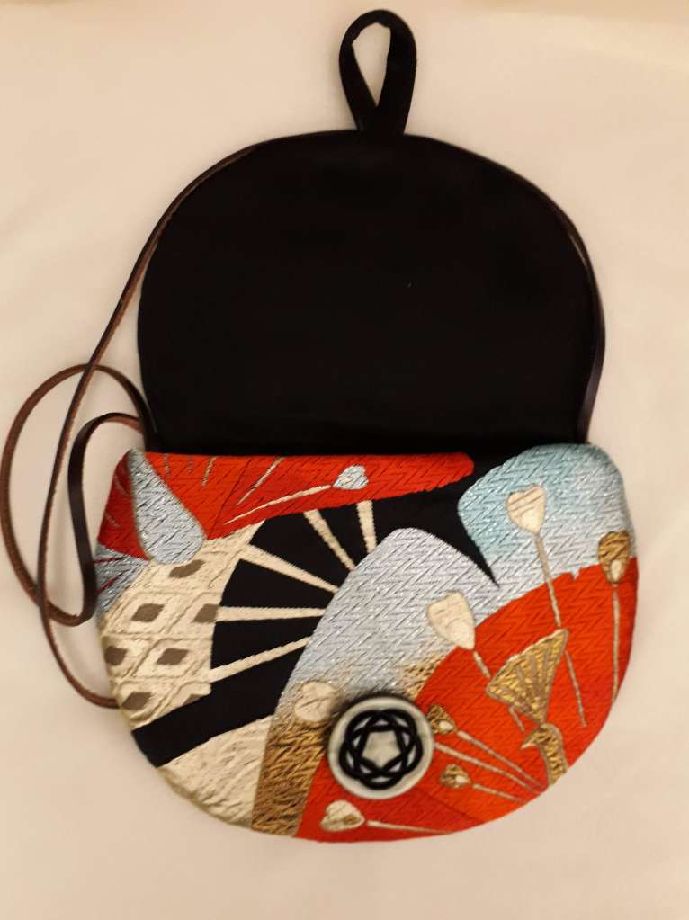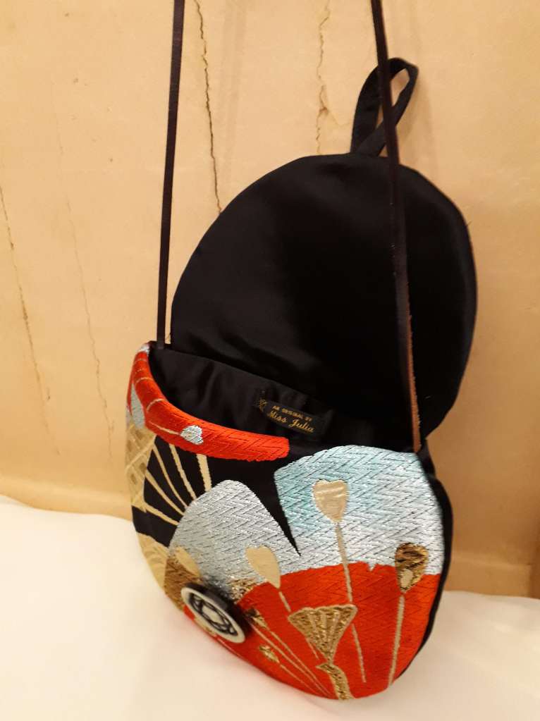 Medium size cross body bag made from stunning vibrant Japanese obi fabric with silk thread peacock design. Backed and lined with black obi satin. Hand finished with 1930’s lucite vintage button and brown leather strap.